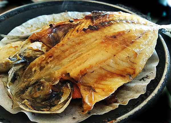 烤一夜干,一上桌時要先放烤盤,才會來得及吃,慢慢烤才能成這種金黃色,感覺需要一壺清酒