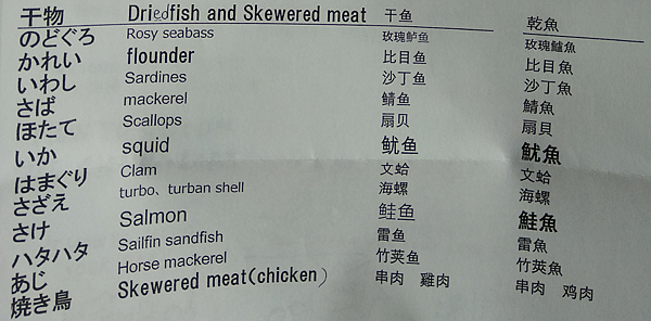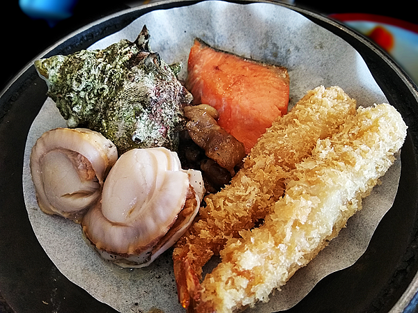 正在等我們的食物們,吃到飽要吃最佳選項,握壽司、炸雞塊、肉串...等等那類味道很平常,鳳螺雖然很大顆,但肉質有點苦,不適合我家