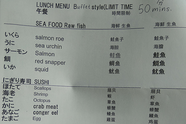 午餐~海鮮無限量,內容有海鮮(鮭魚子、海膽、燻鮭魚、鯛魚、烏賊);握壽司(扇貝、蝦、章魚、螃蟹、鰻魚、雞蛋),4種生魚片、烤魚,烤雞、炸蝦,飲料、茶、水果等。