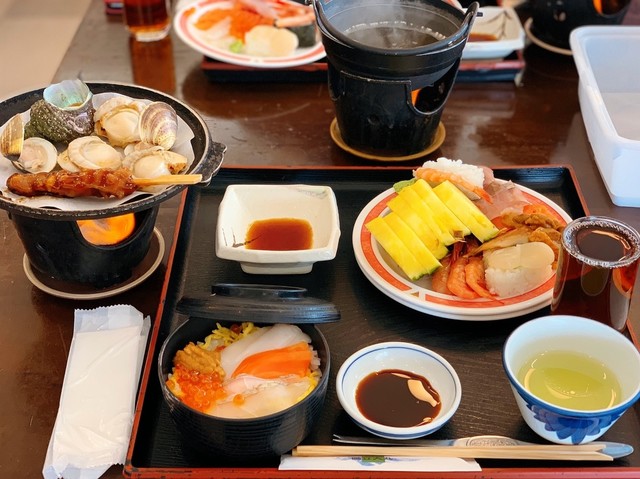 日本飲食放題通常價位都不低,鮭魚卵、海膽、燻鮭魚、凡立貝、大蚌、軟絲,這幾種是大家公認超級棒的海鮮,餐廳食物擺放方式超豪邁,都是以盆或超大盤容器裝,少了日本的精緻感,餐廳以團體用餐為主,除了我們這一車的人,還有日本當地阿公阿嬤團也在這裡用餐,每2人1組小火鍋,每人1組烤盤則,生食或熟食可以自己決定