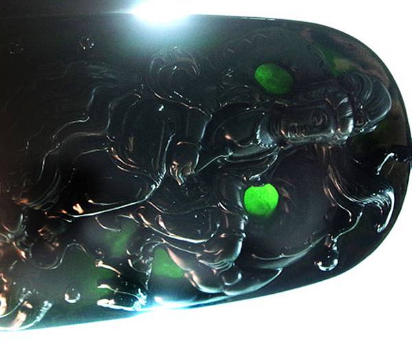 墨翠和墨玉最直接鑒別方法是用透射光照射,墨翠和墨玉外觀都是黑色,透射光下墨翠透出如下圖的綠色,綠色越純正價格就越高,而墨玉是淺黑色調。