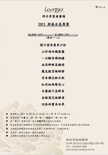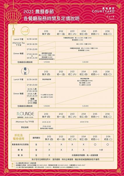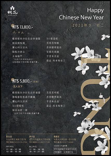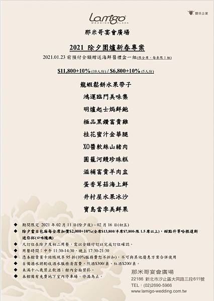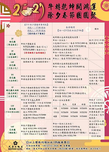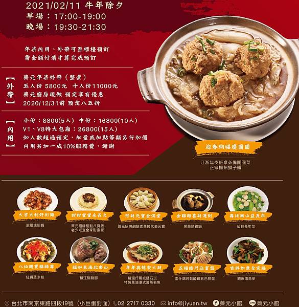 入席時間:2021/2/11(四) 17:10~19:00。每年3/1早上9時開放電話訂位翌年除夕用餐。