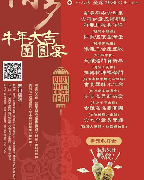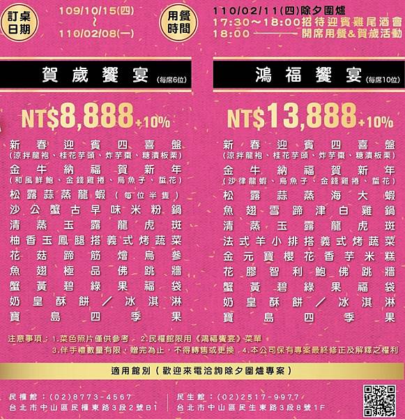 ★ 除夕圍爐桌菜 (每桌10位)價格:NT$17,800+10%★ 春節限定桌菜 (每桌10位)價格:NT$13,800+10%