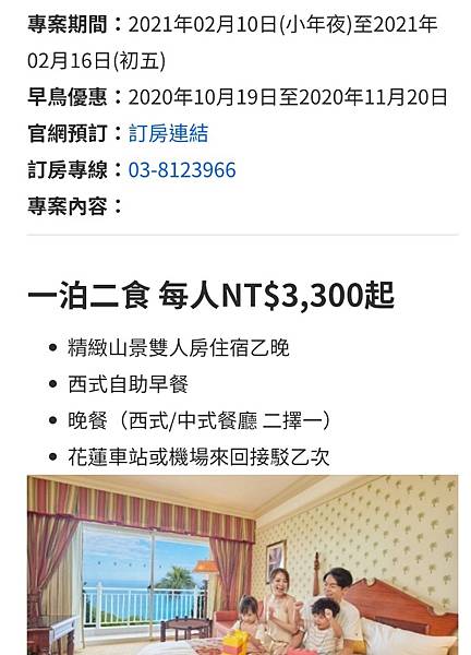 專案時間:2021/2/11(初夕)~ 2021/2/15(初四) 板根雙人房 / 每間 NT$8,800+10% 板根四人房 / 每間 NT$12,800+10% 欲住酒店區豪華客房;每房需加價 NT$1,000。