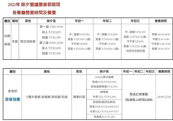 新春饗宴供餐時段:2021/2/11(除夕)晚餐至2021/2/16(初五)午餐。