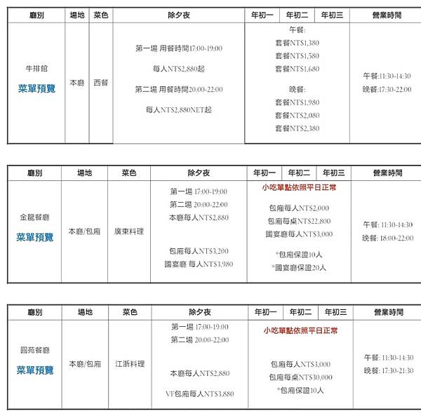 除夕~初二訂位:於10/1(二)10:00起全面開放電話訂位;iEAT饗愛吃金卡/黑卡會員於9/15(二)10:00起優先電話訂位,訂位時請提供會員編號分。