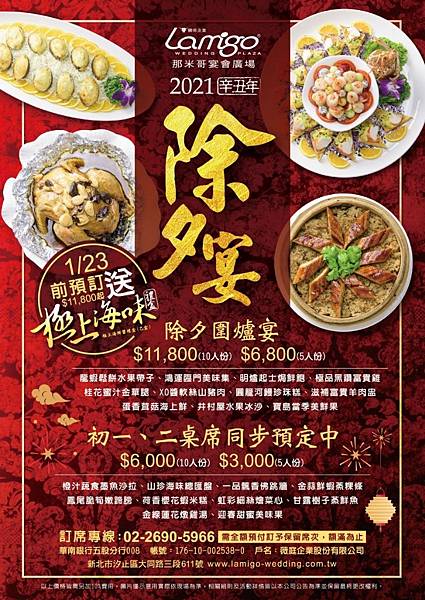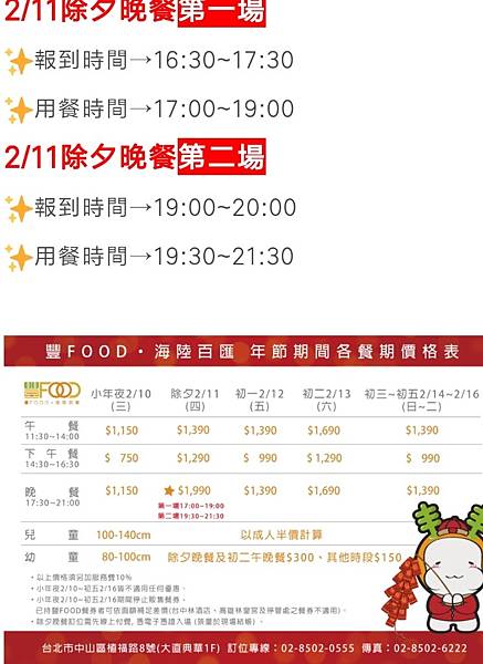 * 除夕夜用餐時間:第一場17:00-19:00、第二場19:30-21:30
