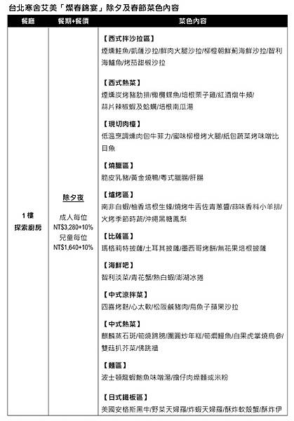 2/4除夕自助午餐每位 $1,580+10%,晚餐兩梯次:17:30-19:30 / 20:00-22:00,每位$1,980+10%,2/5(大年初一)至2/6(大年初二),自助午餐、自助晚餐每位$1,580+10%,訂位(02)7750-3337。