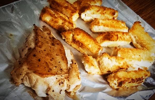 雞胸肉和吐司條同樣都要微煎,都是180度烤8分鐘,2種一起放入烤箱。