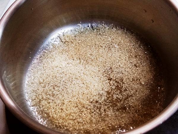 1.鍋中加入二砂和少許水,開中火煮至糖化開冒泡後轉為焦糖色,防止燒焦可以轉動鍋子切勿攪拌,變成焦糖後立刻倒入模具中