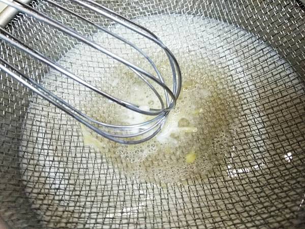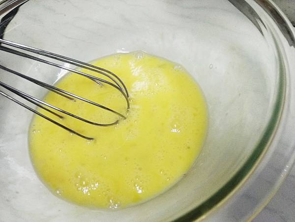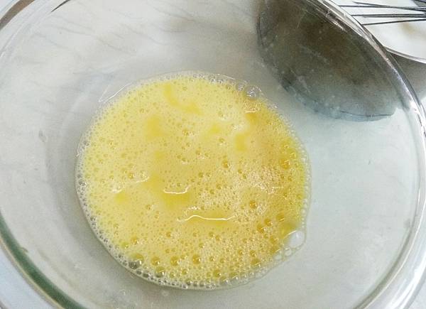 蛋白蛋黃充分混合,像這樣有很多泡泡沒關係,有些做法說不能有泡沫,其實不用介意,只要留意充分混合均勻,不用力過猛到打發的程度