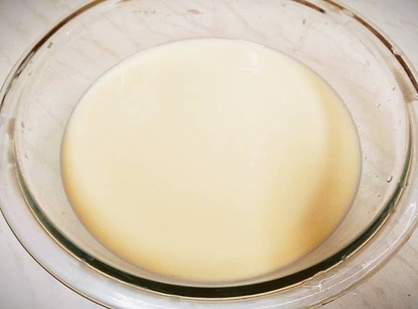 5.過篩是這款焦糖布丁最重要步驟,只要多過篩幾次,泡沫自然完全消失。準備2個容器,開始玩倒過來倒過去過篩遊戲,最適合讓寶貝執行的步驟。剛開始過篩會感覺有點濃稠,牛奶和蛋液分家,這時候沒關係,不需理會,繼續往篩子上倒入另一容器中