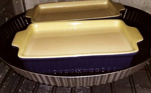 6.隔水烤布丁,水到烤模的1/3,烤箱180度烤35分鐘,烤箱時間、溫度需要依照自己烤箱功率微調,烤模大小也有關係,這部分要自己嘗試幾次,才能準確掌握,若是第一次烤,可以先設定30分鐘,烤好時若布丁搖晃時非常軟的感覺,再追加5-15分鐘