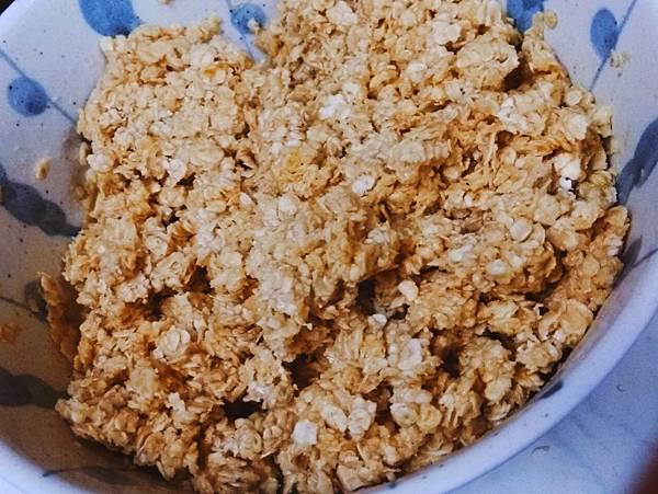 (3.)軟化奶油→將(2)過篩倒入拌勻→加雞蛋拌勻→加入麥片拌勻