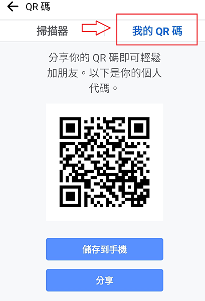 4.就會出現下圖,選我的QR碼,選除吋手機,或分享給朋友,就完成了