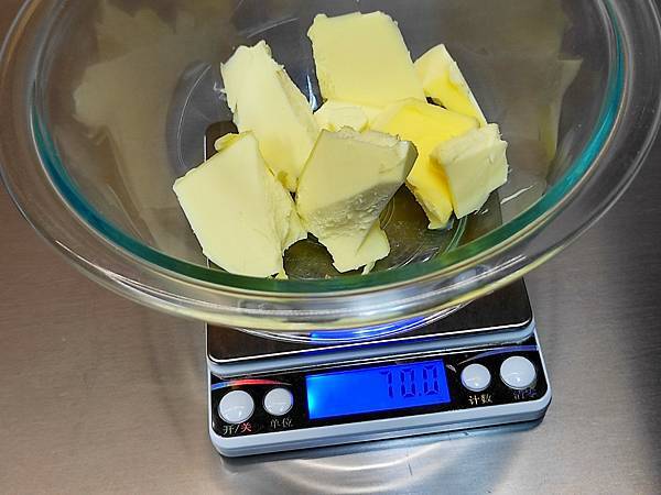 1.奶油放室溫稍變軟(千萬別隔水加熱成液態,這樣無法形成膏狀)70g切小塊放入盆中