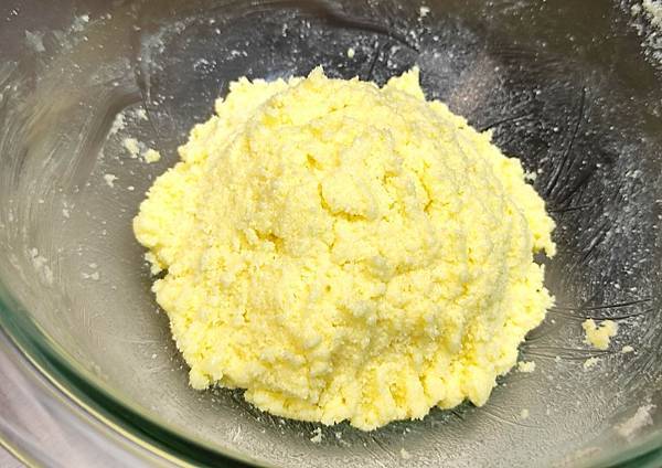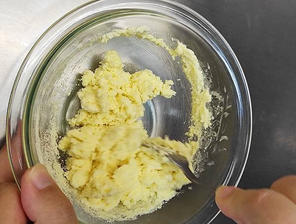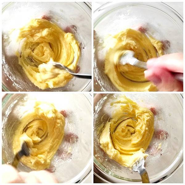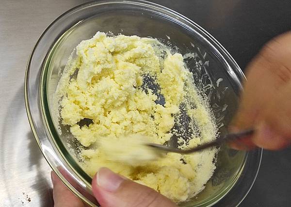 2.用厚叉子搗爛奶油,再攪拌至柔軟膏狀,讓我家男丁將玻璃盆直接放在手心利用手的溫度,叉子順時針,轉轉轉,就成為絲緞般的奶油糊了,過程看起來好療癒