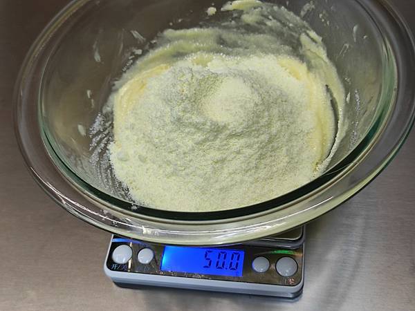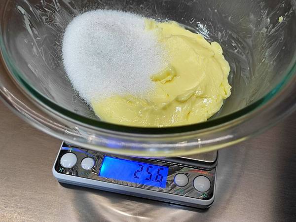 3.打到非常滑順有點泛白的奶油,加入糖粉讓男丁繼續拌勻,糖粉25-30g均可,我不喜過甜,用25g差不多,多一點少一點,可以自己拿捏