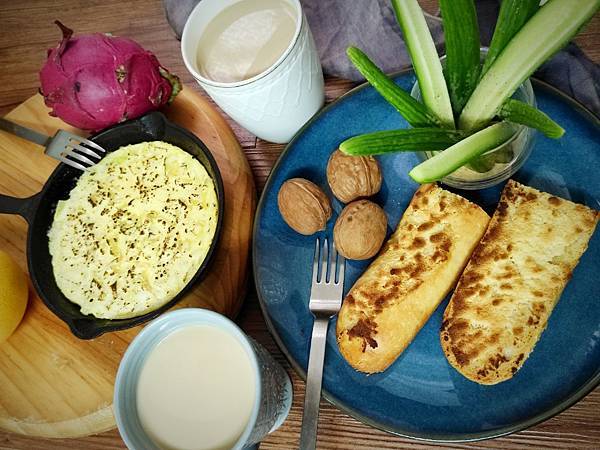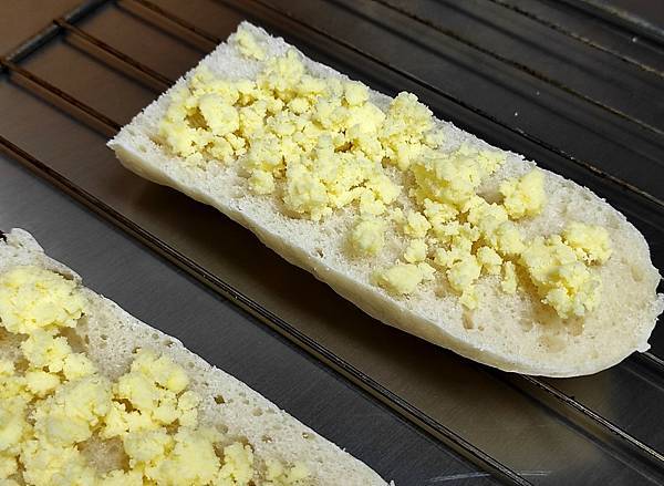 辛苦的男丁終於吃到香噴噴的早餐,法式頂級酥脆奶酥法國麵包,太美味了,男丁一口氣能吃一整條法國麵包
