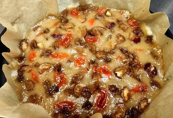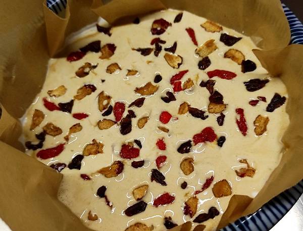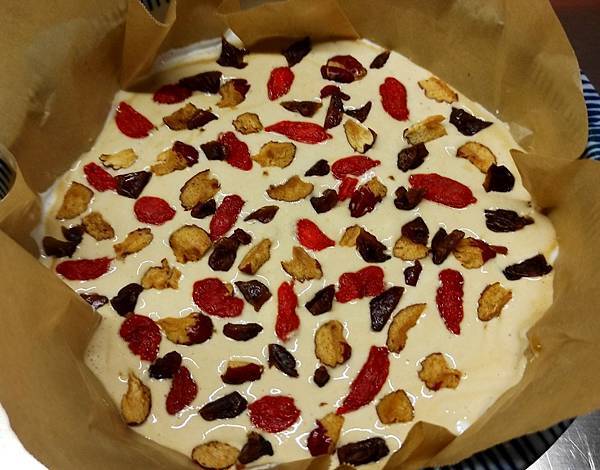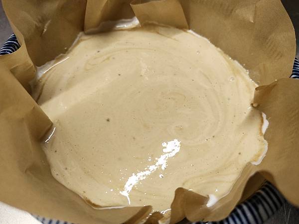 容器內鋪上烘焙紙》倒入糯米漿》加入紅糖拌勻。