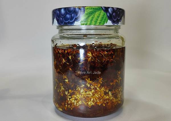 桂花醬也是自己採摘有機桂花,手摘能保留花形完整,自製天然香氣絕對甚於市售,絕無添加香精的可能性。