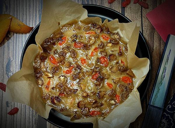 電鍋外鍋2/3杯水蒸,跳起來後悶10分鐘,取出後表面點抹上桂花醬,此時就能聞到多種香氣混合而成