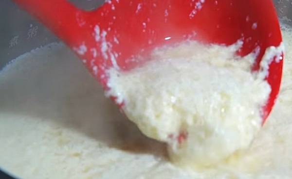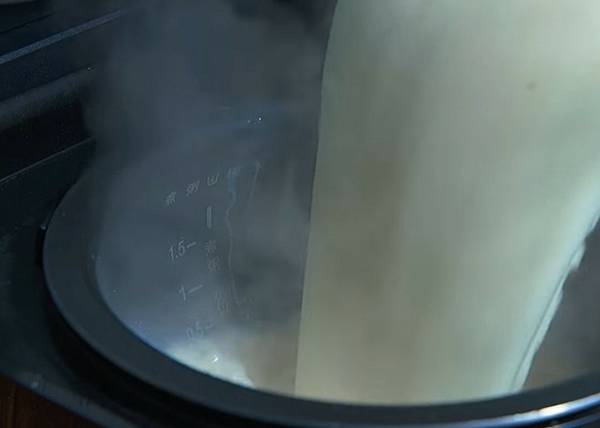 5.電鍋保溫程式,內鍋倒入醋水→沖入豆漿(沖漿),就會變成散狀豆花→蓋上鍋蓋悶10分鐘