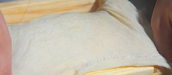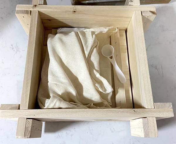 紗布浸濕鋪在豆腐模具內,濕布避免豆腐粘在紗布上不好脫模
