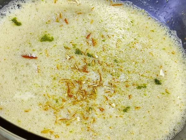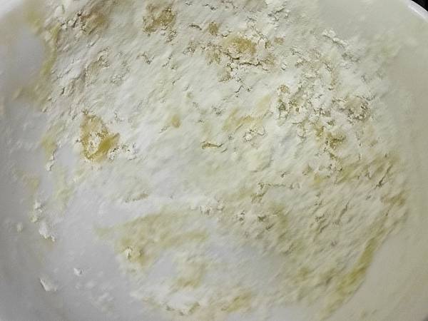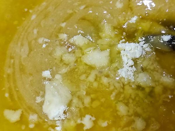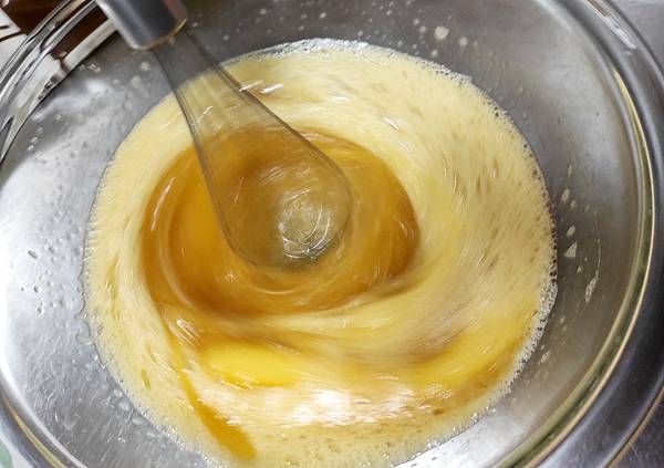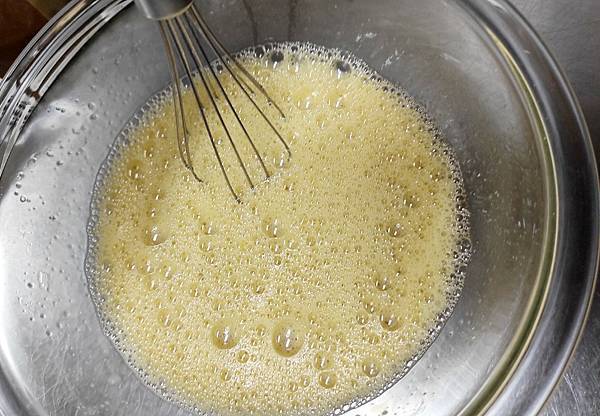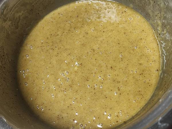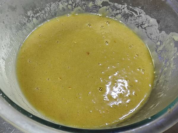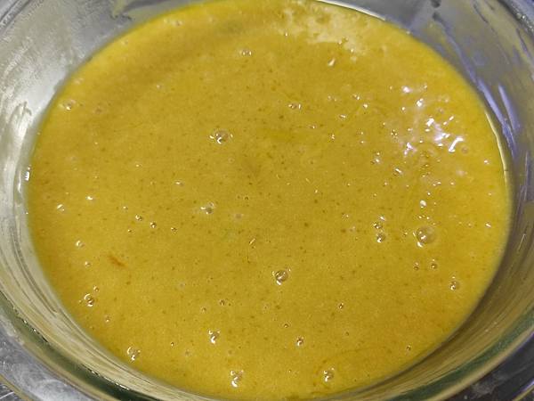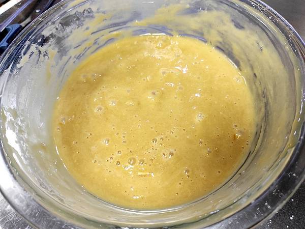 攪完出現很多泡泡,沒關係,等加入麵粉和油後,泡沫就散了