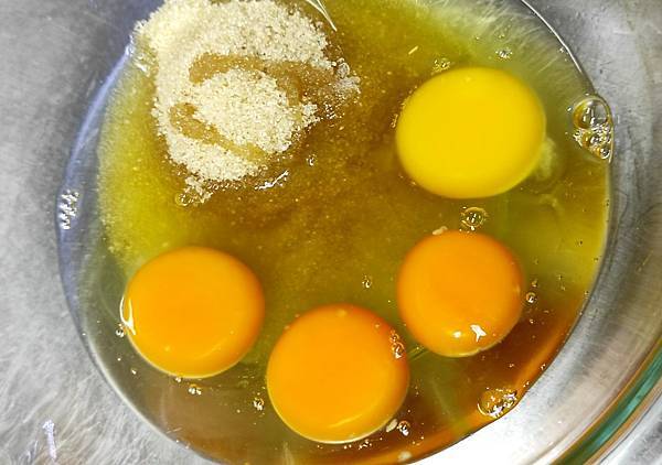 低粉200g、奶油50g植物油110g、糖160g、蛋4顆、醋6g小+蘇打粉3g拌勻取代泡打粉