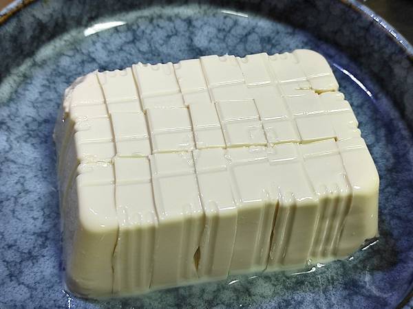 在豆腐上划刀,讓豆腐成塊狀