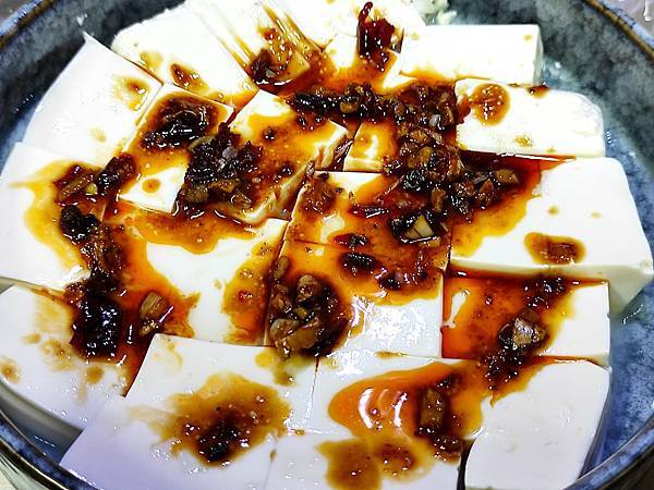 5.取一盒豆腐,倒掉盒內豆腐水,我用的這種嫩豆腐非常容易破,所以整盒豆腐直接倒入深盤