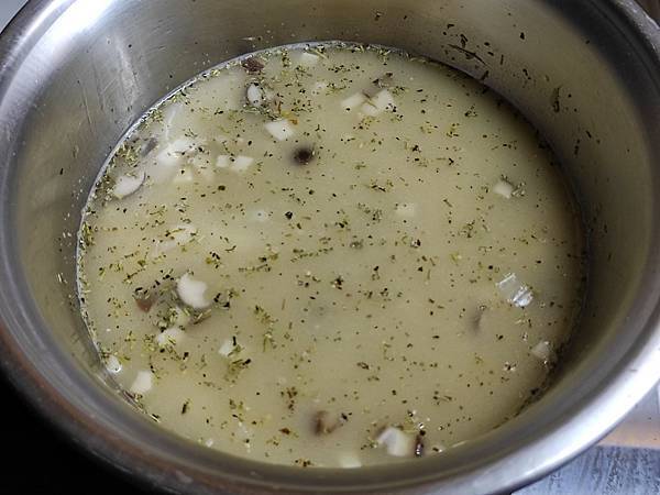 2.鍋中放奶油融化後→加材料們,炒到香氣出來→加調味料們和水→拌勻