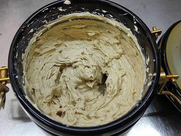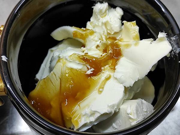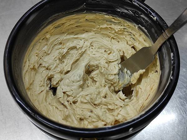 4用打蛋器,攪拌至乳霜狀,罐緣會散出一點乳酪醬。