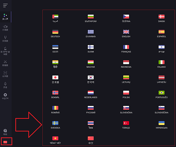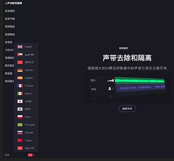 開啟 Vocal Remover and Isolation 網站預設會看到分離歌曲的人聲和伴奏功能,從左側可選擇不同的音樂工具,因為原始網頁為英文語系,使用簡體中文介面看起來翻譯會有一點奇怪(而且有些地方有缺字的情形),如果不習慣簡體中文也可從左下角切換為其他語系。