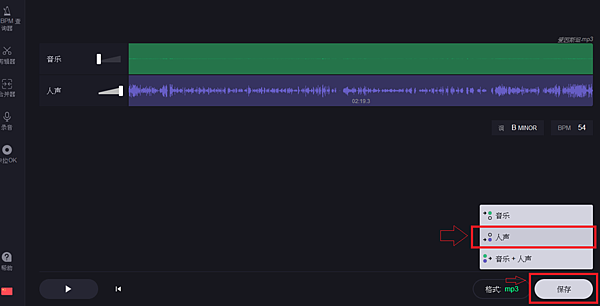 選保存後出現選項>選擇你要的項目,我選"人聲">點"保存"