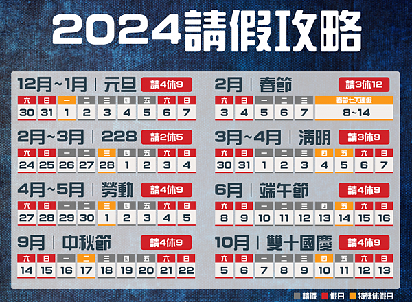 過年放7天,3天以上連續假期有4個,補班日僅剩1天。總放假日數為115日,超過3天的連假一共有4個,包含開國紀念日(3天)、農曆春節假期(7天)、兒童節及民族掃墓節(4天)及端午節(3天)等。另外,2024補班日只剩2月17日一天。
