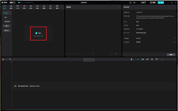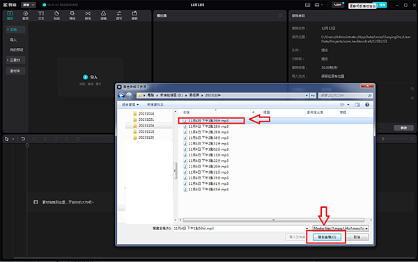 進入剪映後,首先點選導入,我們可將要轉換成逐字稿的音檔導入。
