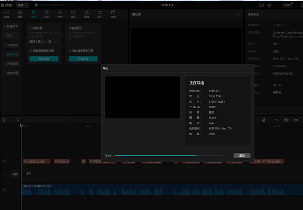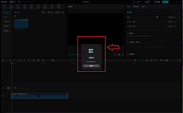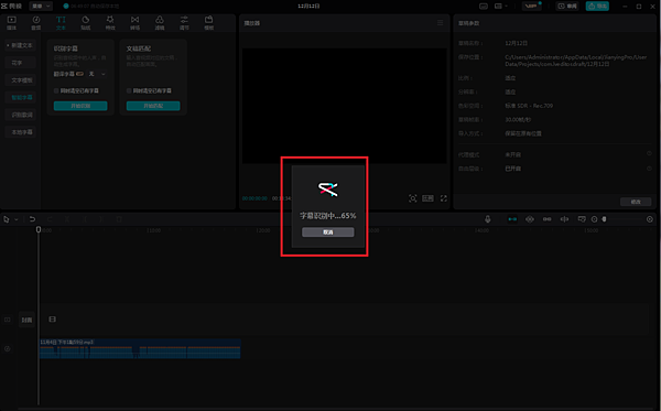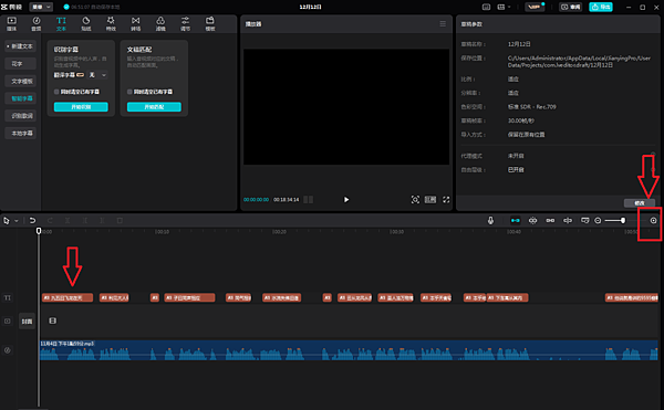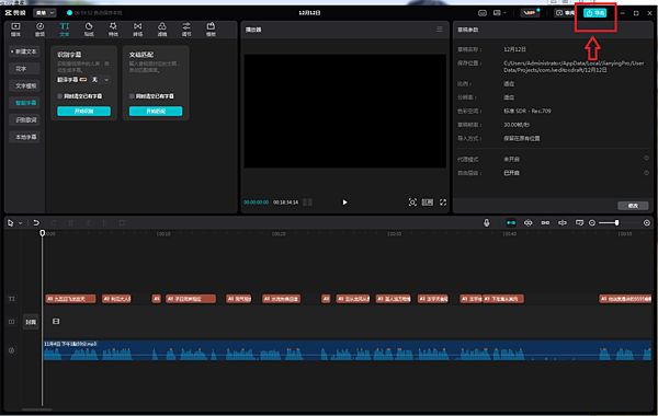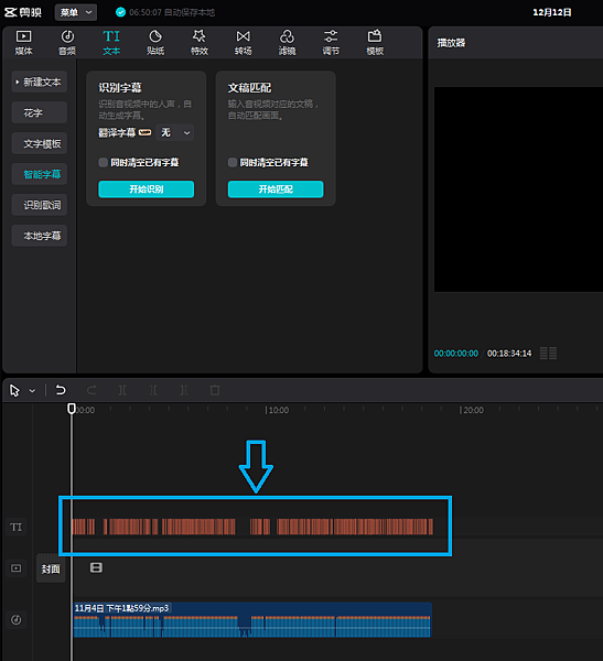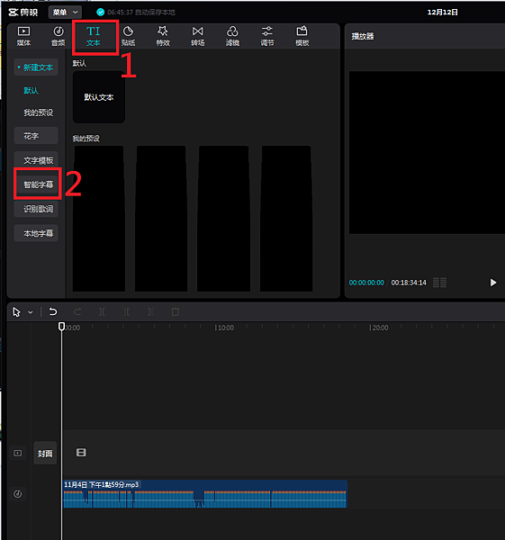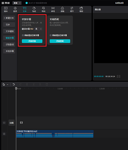 自動生成逐字稿我們利用的是剪映的識別字幕功能,點選文本–>智能字幕–>開始識別