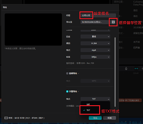 字幕導出,如果需要的是一篇文章的逐字稿,選擇導出TXT。SRT:字幕檔,內容會有時間標記和文字。TXT:純文字檔,不會有時間標記