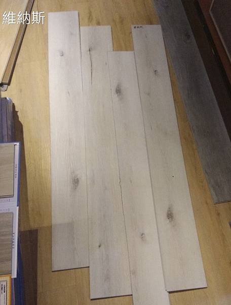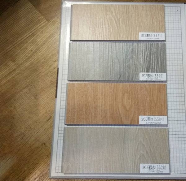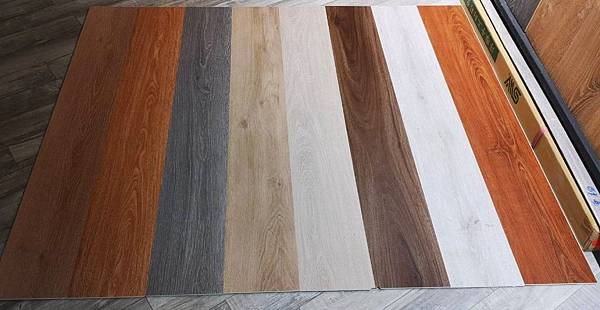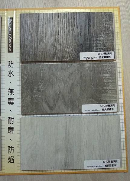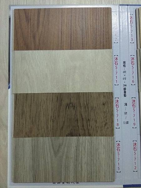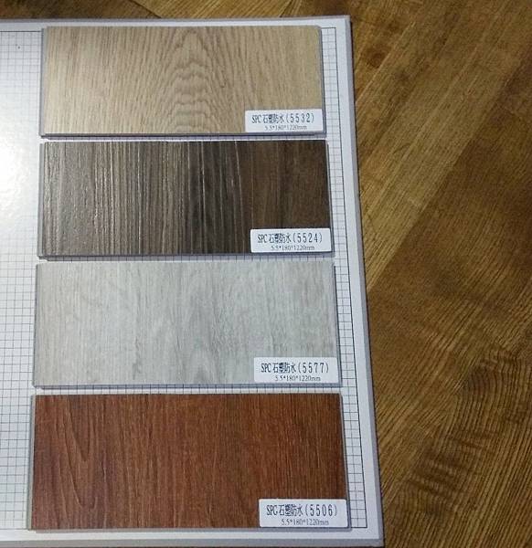 當時覺得6萬轉讓我很心動,不過老闆告訴我看僅看幾萬轉其實不是很準確,這說法打破我的認知,他說還要參考石粉和PVC的比例,並非石粉含量越高越耐磨,板材尺寸越大地面平整度要求要更高,像我家這種老宅歷經各種大小地震加上長年熱脹冷縮,地面看似平整卻無法像新屋那般水平,板材大不見得是優點,這款老闆自有品牌和我原來鋪的價位相同,耐磨度確更高一些,老闆自有品牌,型錄有這幾種顏色