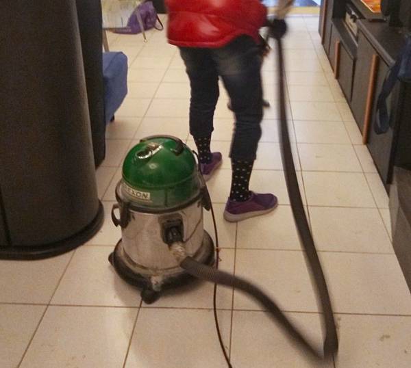 施工前老闆娘用吸塵器大致吸一下地板表面,只是"大致"隨意吸一次,所以徹底清潔要靠自己,清潔工作太早做容易有灰塵,前一天晚上自己清潔很重要,一定要將地板擦得很乾淨,因為石塑板鋪上後,所有髒污會全封在裡面,卡扣雖然看起來密合,但畢竟是卡扣,若有衣蛾、蟑螂卵什麼的留在裡面,日後就不妙了