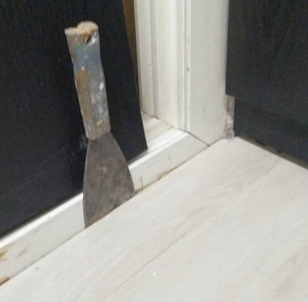 門框邊和地板交接處需要切很小的弧形,這種地方,電動切割工具和經驗真的很重要,和老闆娘比起來老闆技術好很多,前半區都切的滿好,可能快到午餐時間肚子餓沒體力了,這裡的不規則弧型有毛刺邊沒有磨平就直接鋪,細看縫隙也不等寬