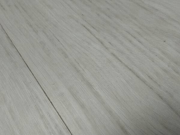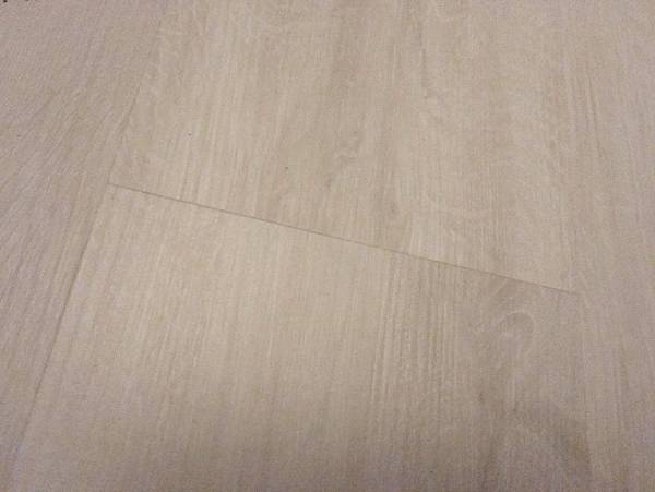 踏感部分,畢竟PVC不是實木地板,裸足踏感絕對比實木差但還能接受,普通自黏款和超耐磨質感、紋路仿真度差很多,正所謂一分錢一分貨,超耐磨系德國高能得思卡扣地板,產品價格高低落差很大,平時1坪4200起跳的德國高能得思卡扣地板,剛好有2種入門基本款做促銷,連工帶料1坪3500,這應該是他家最便宜款式(鋪設時移動簡單的室內傢俱沙發+餐桌椅,費用1000起跳,因為特價所以價位+質感都勝特力屋所售任一款非常多,不過最大問題,這種超耐磨地板防潮性尚可,所以鋪設前底下要加鋪一層防潮墊,且不適合鋪在廚房,萬一水管漏水滲入地板縫隙,地板可能會因為水氣不散而鼓起來,這是所有黏式和卡扣式超耐磨地板的問題,不宜泡到水或過於潮濕的環境,若浸到水,後續會非常麻煩,高能得思銷售小姐說,她家鋪完沒多久就遇到這狀況,地板就暴銷了;廚房水管何時出狀況,是神仙難斷。