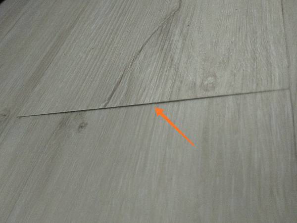 多處卡扣交接出現下圖這樣的線狀高低差大約0.05-0.1CM,腳踏時不太有感覺,但若在地板弄濕後灰塵又累積上去時,灰塵會卡在裡面,尤其廚房,油炸料理時的油多少都會飛濺在地上,即使像我選則淺色,這時候也不用太擔心,立刻用濕抹布與地板卡扣線平行擦,再順著地板垂直紋路擦,很容易擦乾淨,千萬別與有高低差的卡扣線垂直擦,這樣會將灰塵卡進凹凸處而擦不乾淨,這種深紋的石塑地板,因為紋路深,容易積灰塵,乾的狀態下清掃時,要和紋路平行掃,表面能掃乾淨,若用掃地機器人,那就沒這些需注意的地方,全交給掃地機即可