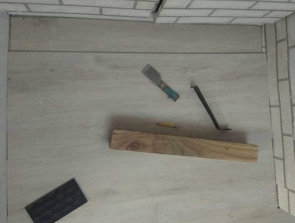 老闆帶來的幫手,這收邊 真是讓人欲哭無淚,若是用封邊條的人應該不怎麼在意,我不用封邊條,邊緣一定要平整,看到這樣的品質讓我在內心不斷祈禱老闆的朋友鋪設速度能盡量緩慢點,多留一點面積讓老闆施工,老闆技術優於老闆娘,老闆娘技術優於老闆的朋友,有鋪設技術比較後才知鋪石塑地板看似簡單,動手後還真有點難,中間部分基本上只要力氣夠大應該能安裝緊密,收邊處DIY就不一定能做得好,老宅房子地坪通常都不是垂直線,會傾斜,老闆的朋友在切SPC時都是只抓板材的水平,不管交接面,而且沒有一片切成標準直角,所以每片卡上去後看起來一定是斜的,若對品質在意,一定要確認有能力完美收邊再自己DIY舖SPC地板,否則邊緣應該會比這樣更慘不忍睹