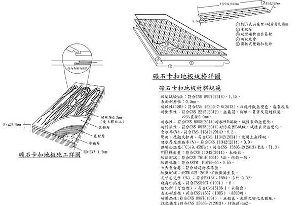 剛好有一片石塑板和防潮墊接合處分離的廢片,厚度4mm石塑板材+防潮墊2mm,中間用膠高壓密合而成,老闆說有客人不放心,鋪之前先泡在水桶中實驗,經過48小時再乾燥後也不脫膠、不變形,也有客人廚房鋪完後,直接倒一桶水在上面看看水會不會往下漏,這些都是指為切割過的板材